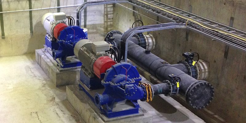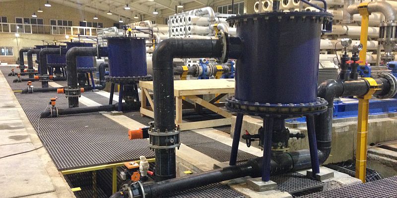 1. Project process: The feed water is taken from the Persian Gulf through beach wells, is chlorinated, and subsequently sent to sand filters via a transfer pipeline. The water is then stored in tanks. The filtered water in the tanks is sent to cartridge filters by a pumping station and conducted towards the SWRO units. In order to distribute the water to the city of Kangan, a 6 km transfer pipeline is constructed from the concrete permeate tank to the city's water network.